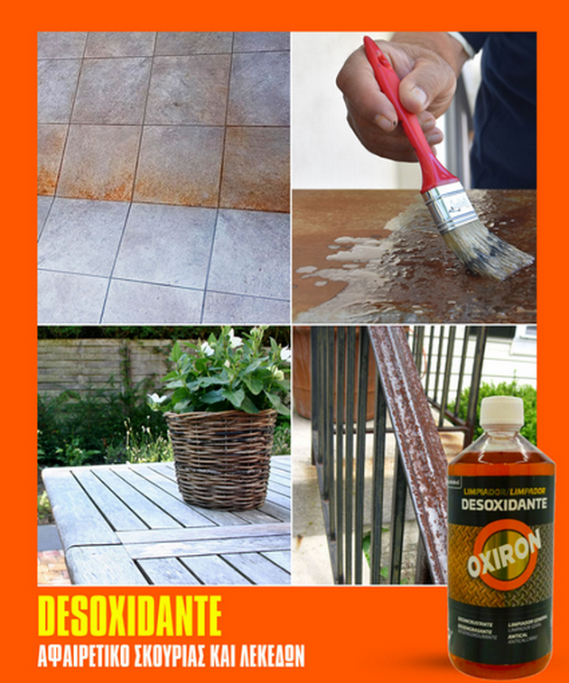 Το καθαριστικό Σκουριάς Desoxidante Oxiron είναι ένα πολυ χρηστικό προϊόν πολλαπλών χρήσεων. Είναι εξαιρετικό καθαριστικό γενικής χρήσης που αδρανοποιεί την σκουριά και την καθαρίζει, απομακρύνει τα άλατα, απολιπαντικό και καθαριστικό ασβεστολιθικών ουσιών. Το Desoxidante καθαρίζει και γυαλίζει σίδερο, ξύλο, μέταλλα και επιχρωμιομένες επιφάνειες.